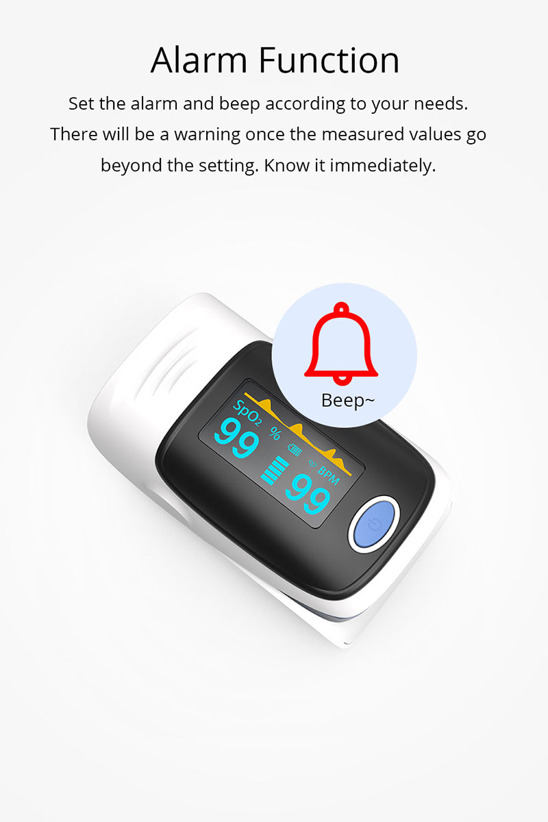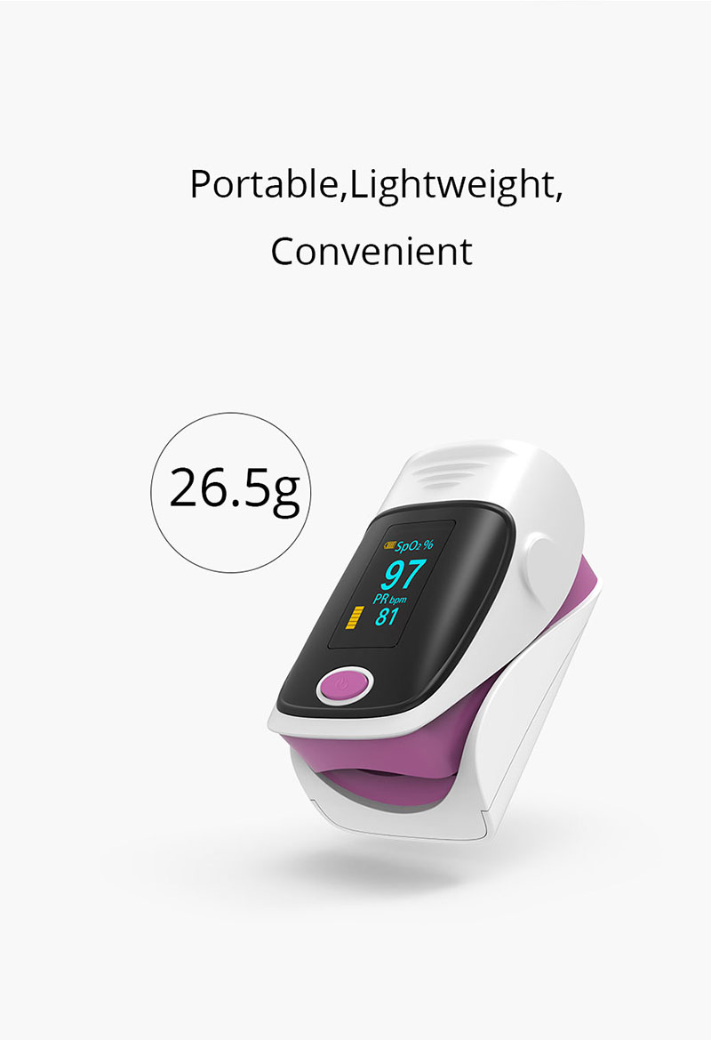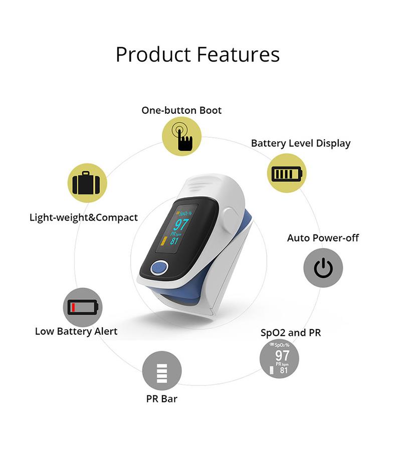 Оксиметар отиска прста је приступачан и тачан начин провере брзине пулса и нивоа засићености кисеоником у крви. Такође показује талас плетизмографа, што гарантује тачност. Самонаравнајућа стезаљка за прсте плус једноставан дизајн са једним дугметом омогућава лакши рад. Долази са торбом за ношење и каблом за врат / запешће. Погодно за сестру и лекара да виси о врату. Мала преносива величина олакшава руковање и ношење. Погодно за свакодневну употребу, мере у сваком тренутку своје здравље.